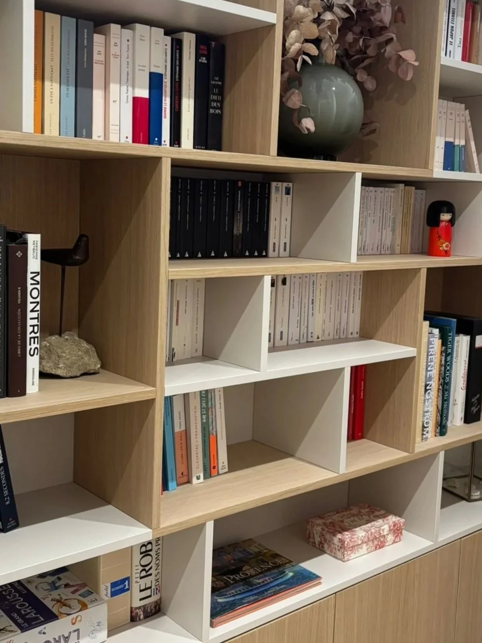 Conception d’une bibliothèque sur-mesure associant le chêne au mélaminé. Une pièce unique alliant esthétisme et fonctionnalité.